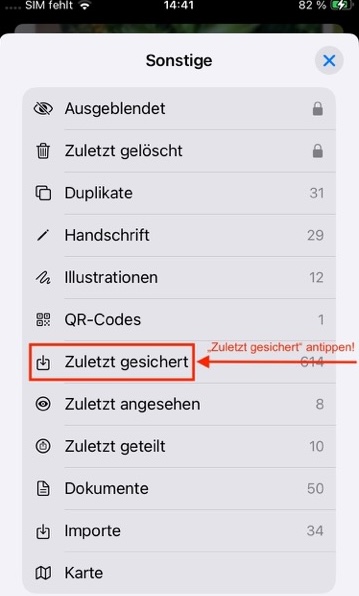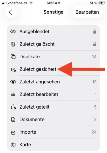5. Tippen Sie, wie im Screennshot oben zu sehen, auf "Zuletzt gesichert".