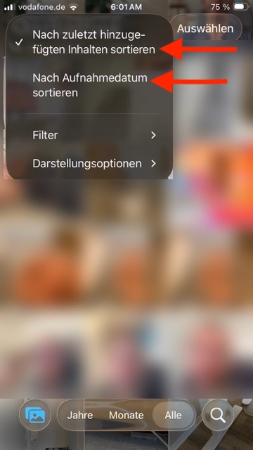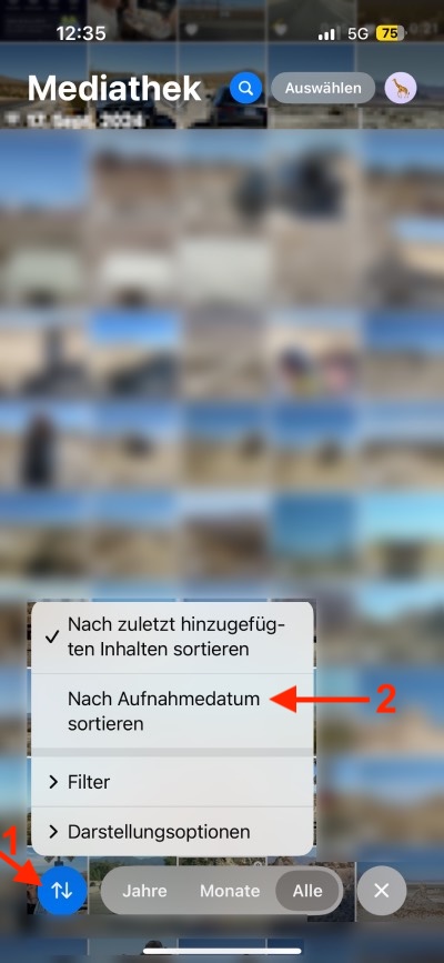 - Tippen Sie dieses Icon mit den Pfeilen an. Sie können nun die Sortierung z. B. auch nach Aufnahmedatum ändern. Ihre Fotos/Videos werden dann in der Reihenfolge angezeigt, in der sie aufgenommen wurden: